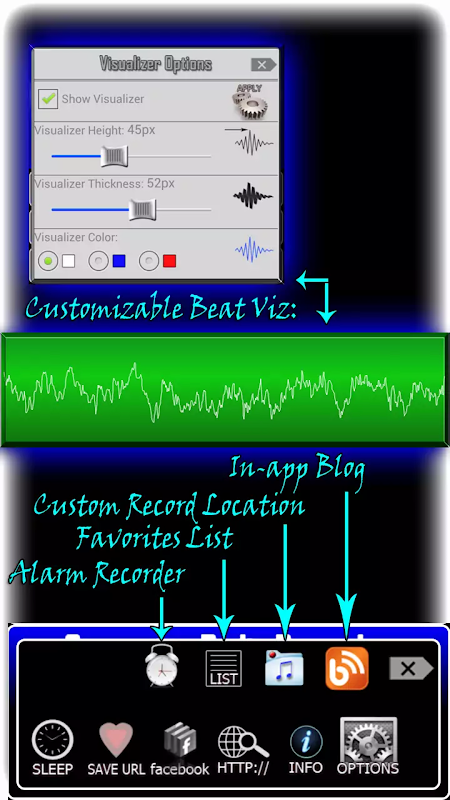 • Record hours of music/talk/news while you sleep (schedule it with the Alarm recorder), then listen to your recordings bandwidth-free the next day in your car, at work, etc.