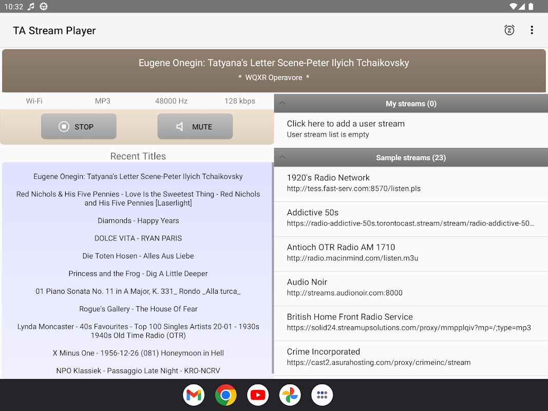 Internet audio stream player with customizable stream list and sleep timer.