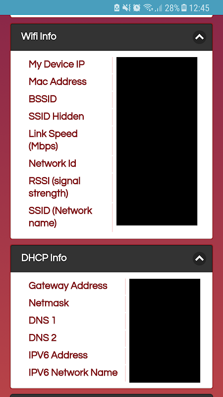- Lots of wireless network info including: My device IP on the network, Mac Address, BSSID, Link Speed, Network ID, RSSI (signal strength), SSID, DHCP info, DNS, IPV6 name and IPV6 address and Gateway Address.