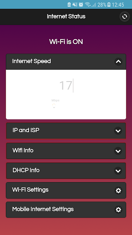 - Internet speed test (Fast download speed is displayed as soon as you open the app; there's a handy reload button at the top to recheck wireless or mobile internet speed)