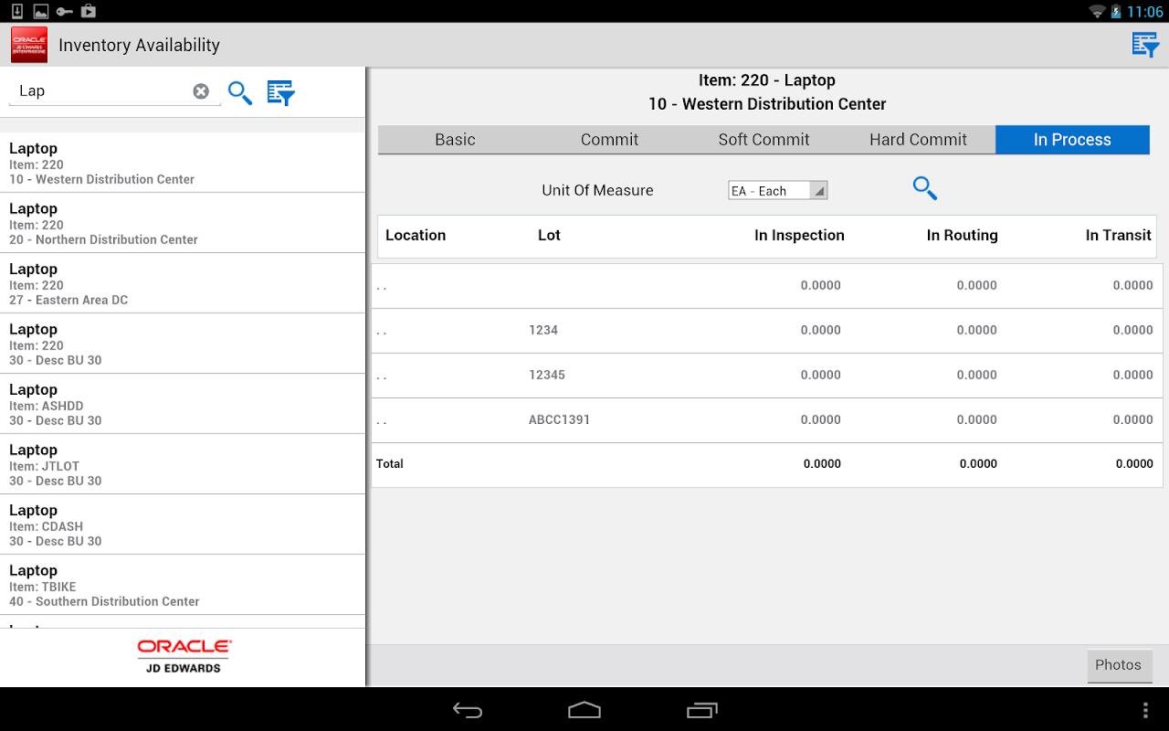 JD Edwards EnterpriseOne Inventory Availability Mobile Tablet enables users to search and view detail item information by branch/plant within their respective locations and lot. You can view the summary information along with locations and item availability per unit of measure. You can view the details information to determine how much inventory is on hand, committed, backordered, and available for the selected item.