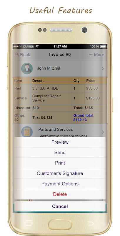 - Another feature supported is mobile PRINT. If you have a mobile printer, then you'll be able to print your invoices on the spot. If not, then you can send the estimate or invoice through email, facebook, SMS, etc.