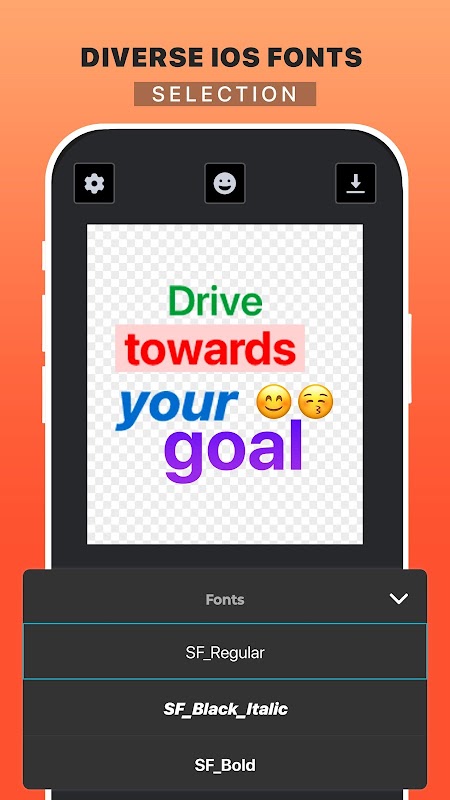With this Font iPhone for Android, you can change the font style of your created visuals, as it offers various iOS font styles. It enables you to align your text as it provides letter spacing and line spacing features. You can also apply colors, gradients, and images to your text. Additionally, you have the option to apply font styles such as shadow, underline, and border to your text.