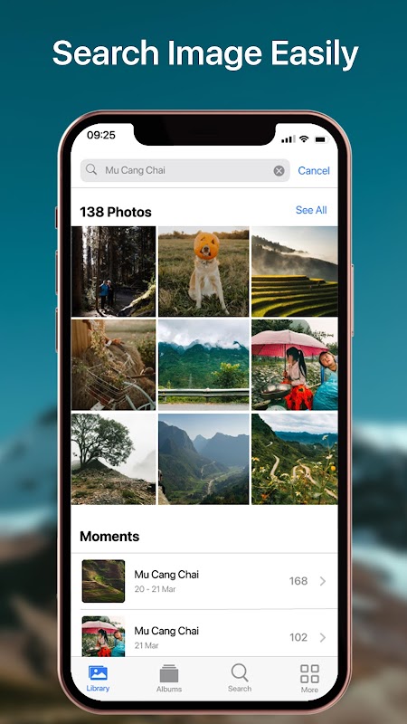 - Fast search photos and videos by place, albums, moments, months, name