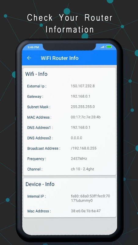 IP Information – It shows Wifi or Internet IP Informations like Signal, Speed, Location, SSID, Internal IP Mac Address, Frequency, connection type and many more.