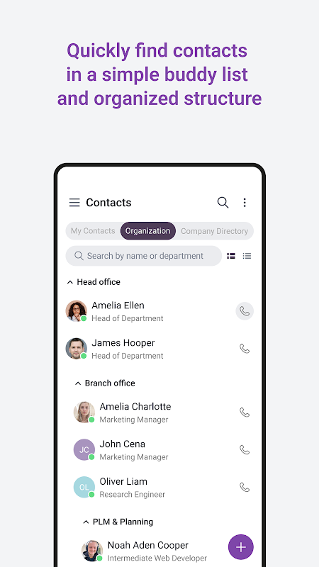- Contacts – shows a buddy list/favorites for users’ own setting and company’s organization