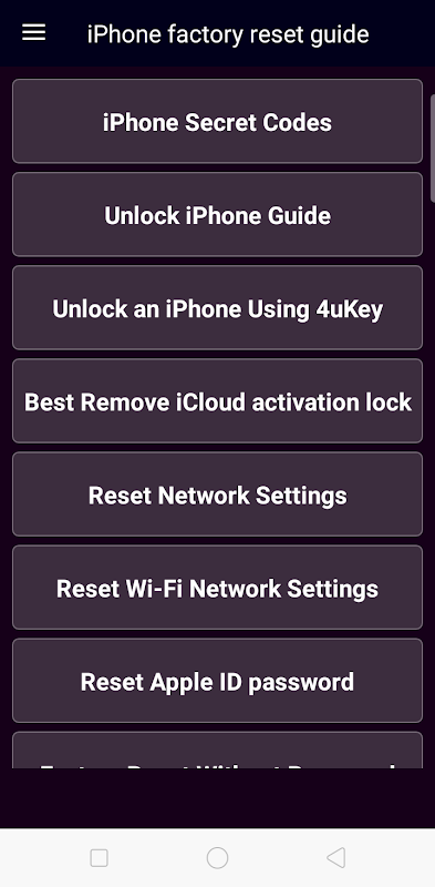 This app has Unlock iPhone Guide, Unlock an iPhone Using 4uKey, Best Remove iCloud activation lock, Reset Network Settings, Reset Wi-Fi Network Settings,>Reset Apple ID password Guide.