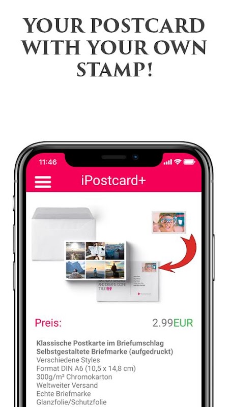 Thanks to iPostcard you can create a personal postcard, add personal wishes and finally send it as an actual postcard. Quick, intuitive and reliable!