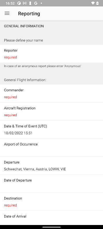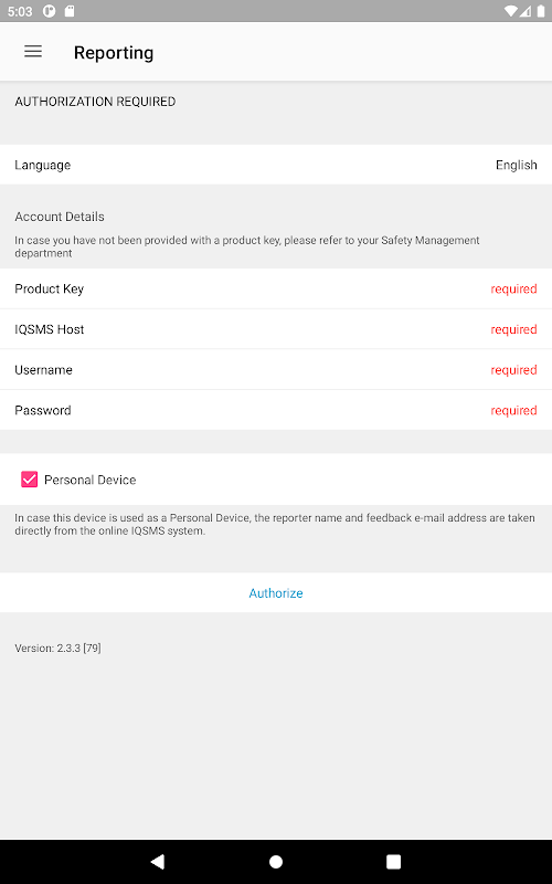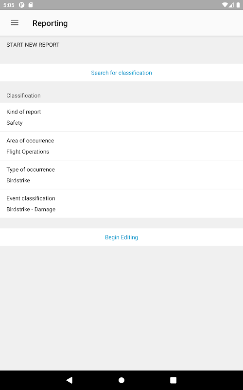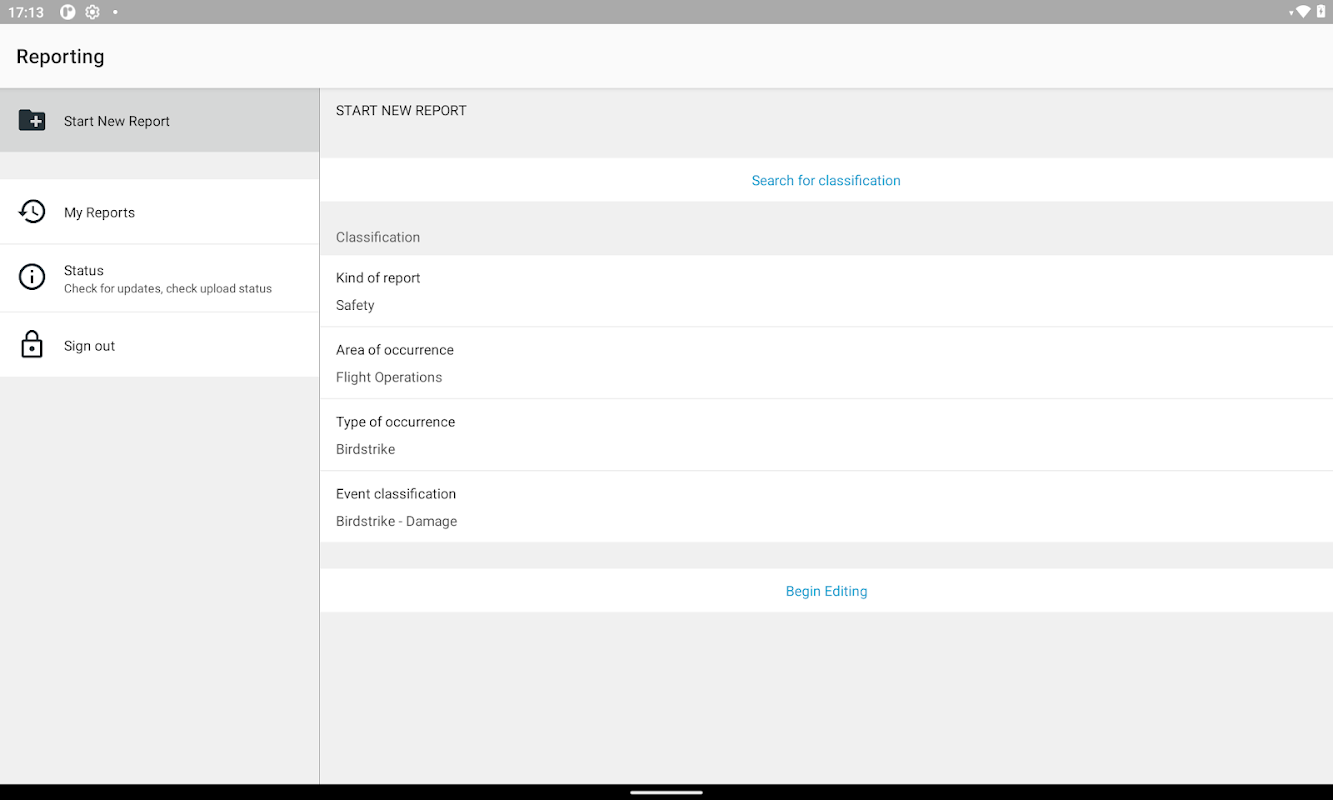 During the process of authentication the report forms customized to your particular organization will be downloaded automatically. Select the appropriate report form and file the information relevant to your Safety department. As soon as Internet connection is reestablished the report you entered is automatically sent to your Safety department.