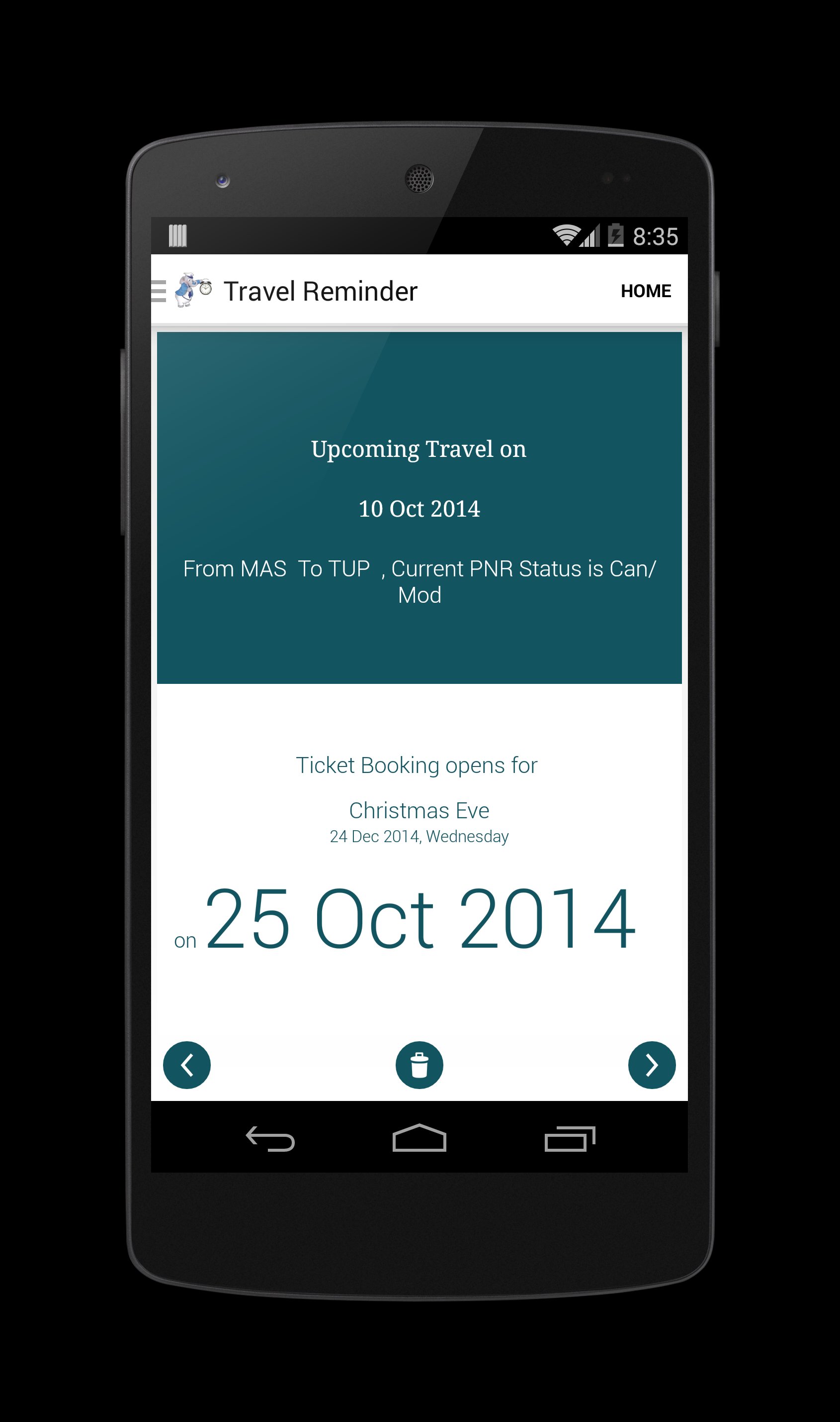With the Travel Booking Reminder app, you don't need to worry about remembering dates for ticket bookings in IRCTC anymore. Travel Booking Reminder app sends auto notification/alerts on the first day of Advance Reservation Period for all the holidays. It comes with an exhaustive list of Indian holidays and can be added for any additional dates also