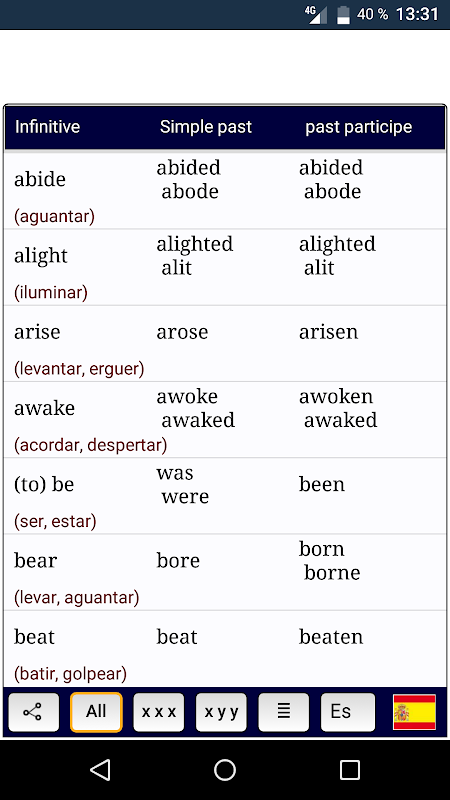 205 irregular verbs with translation into French, Spanish, German, and Italian. Pronunciation (voice) is done by artificial intelligence.