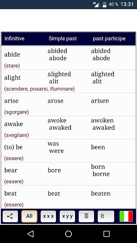 205 irregular verbs with translation into French,, spanish, german, and italy. Pronunciation (voice) is done by artificial intelligence.