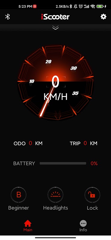 The Main screen shows speed and battery current in large, readable figures. Lock or unlock the scooter quickly, change gear mode, and toggle the light without digging through menus. In busy traffic or at night, iScooter keeps essentials front and center to reduce distraction.