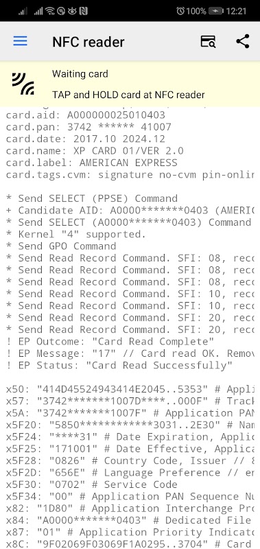 Card data reading implemented with PPSE selection, AID selection, GPO and Read Records APDU commands execution.
