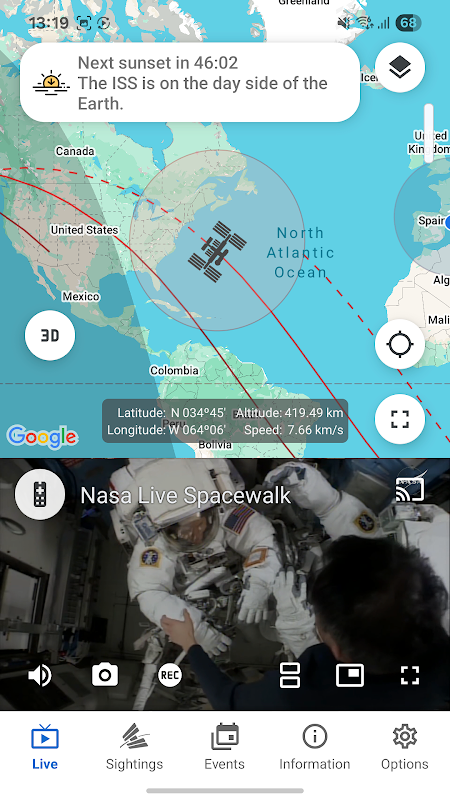 This application integrates Google Maps to track the orbit of the ISS at all times and allows you to configure parameters such as the choice of different types of maps, satellite or terrain. It also shows telemetry information (speed, altitude, longitude, latitude), as well as the area of the country where the ISS is located. It also has a day/night map of the land with the limits of visibility from the ISS and the user.
