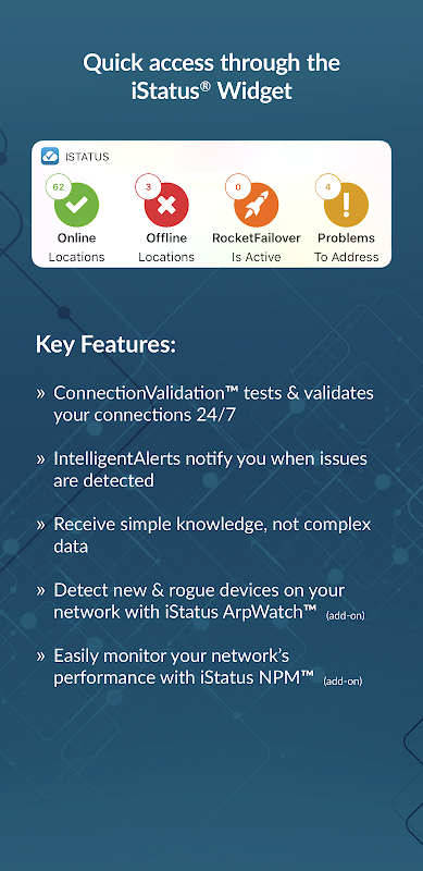 • iStatus IntelligentAlerts™ - keep you up-to-date with the current status of your network connectivity, delivered right to your smartphone, device, or via a bundled email.