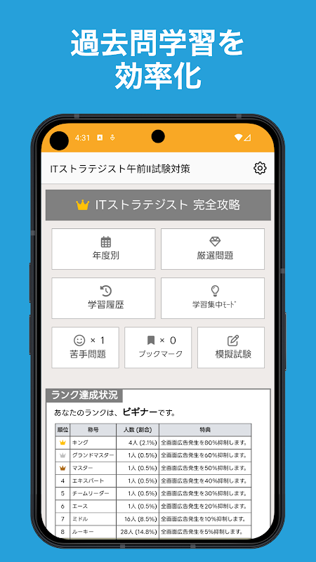 ≪2025 Spring Examination≫ Thorough analysis of question trends in the IT strategist exam over the past 10 years. Greatly improve your efficiency by studying past questions in this app in the order they appear. Operability that allows you to learn even on a crowded train.