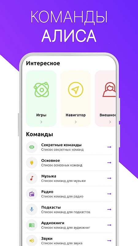 Обращаем ваше внимание, в данное приложение "Команды для Алиса" не встроен голосовой помощник Алиса. Это справочное приложение с командами для голосового ассистента Яндекс Алисы. Здесь вы найдёте полный список голосовых команд, разделенный на категории.