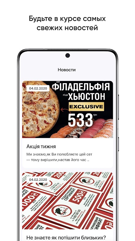 Utilizzando l'applicazione mobile, puoi facilmente ordinare la pizza per ogni gusto e dimensione. Inoltre nel nostro menù troverai sushi, panini, insalate, dolci, snack caldi e altro ancora. L'ordinamento per prezzo, descrizioni dettagliate e foto di alta qualità dei piatti disponibili nell'applicazione ti aiuterà a scegliere esattamente ciò che desideri.