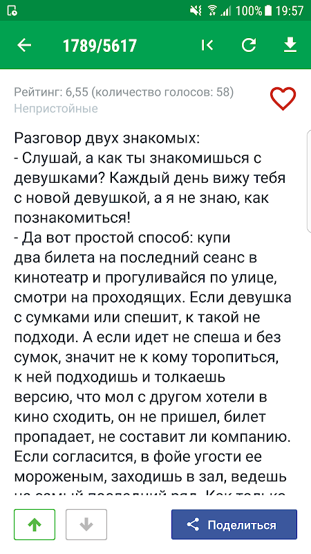 Загрузите приложение Анекдоты XXL Pro, в котором вы найдете лучшие, уникальные русские приколы. Все они встроены в приложение, поэтому для их чтения не понадобится интернет. Приколы можно просматривать несколькими способами: Новые, Лучшие, Избранные. Можно оценивать приколы, ставя им «плюс» или «минус». Можно создать свой собственный список любимых шуток, просто кликнув на иконку «сердца».