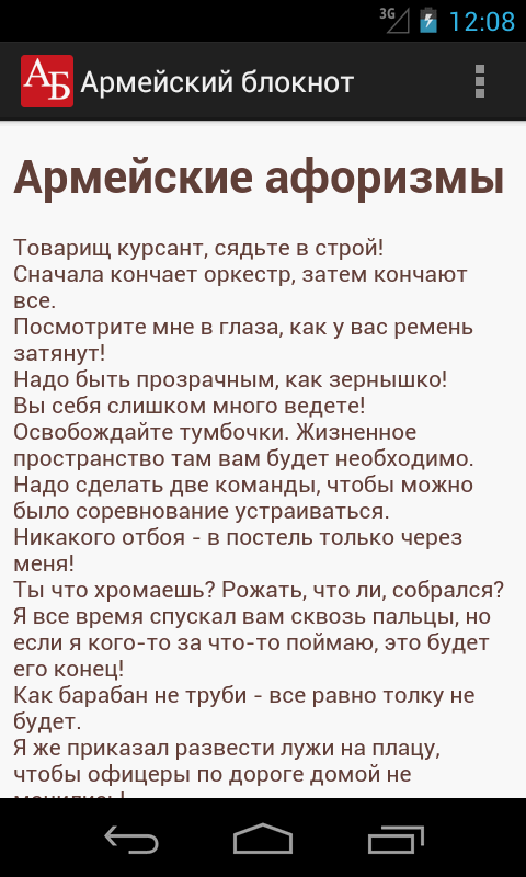 Постоянно обновляемое приложение. Добавляются новые армейские цитаты, песни, стихи, байки и т.п.Следите за анонсами!