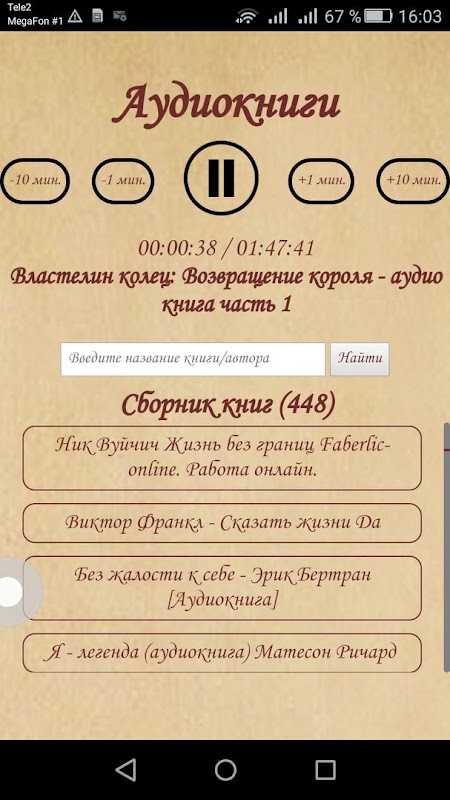 C'è un comodo pannello di controllo e ricerca. Non devi preoccuparti del luogo in cui hai smesso di ascoltare, poiché il tempo di ascolto viene automaticamente registrato e per ogni libro separatamente! Questo ti permetterà di ascoltare in parallelo diversi audiolibri!