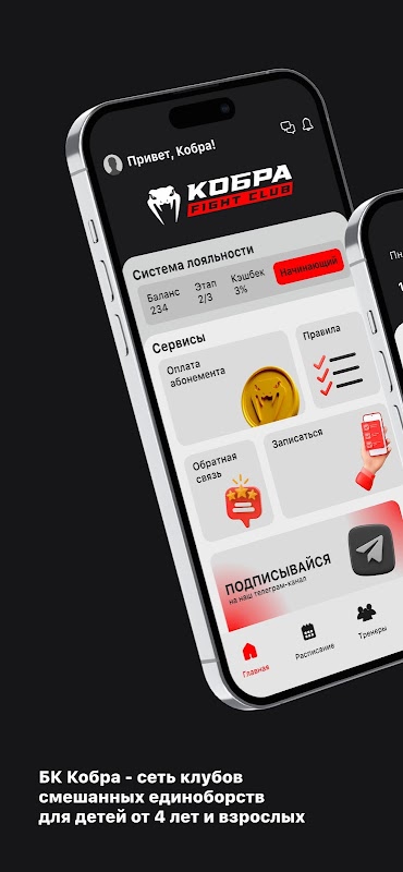BC "Kobra" è una scuola di arti marziali miste e ginnastica ricreativa con elementi di arti marziali per bambini dai 4 anni e adulti. La nostra palestra è completamente attrezzata secondo gli standard europei e dispone di una palestra altamente attrezzata!