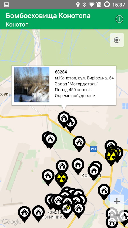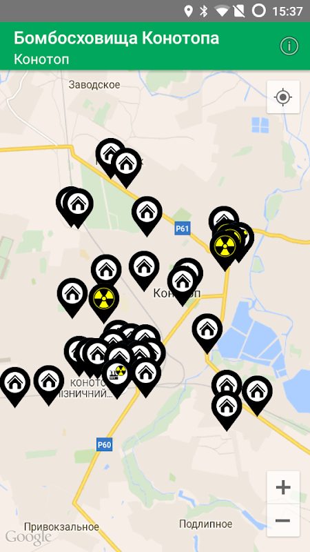 Мобильное приложение для Android "Бомбоубежища Конотопа" было специально разработано для информирования населения о местах укрытия от чрезвычайных ситуаций техногенного, природного и военного характера .