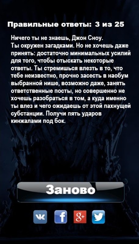 2. Согласно Вашим ответам Вы еще и узнаете кто Вы в сериале Игра Престолов. Причем в подсчете учитывается не только количество правильных ответов, но и другие показатели. Так к примеру даже отвечая неправильно, но с наиболее приближенными к истине ответами или просто выбирая смешные ответы, вы получите другой результат.