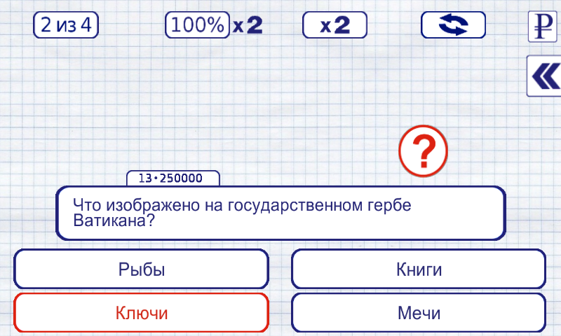 - Вам предоставляется возможность использовать 4 типа подсказок - "Правильный ответ", "2 из 4", "Второй шанс" и "Замена вопроса".