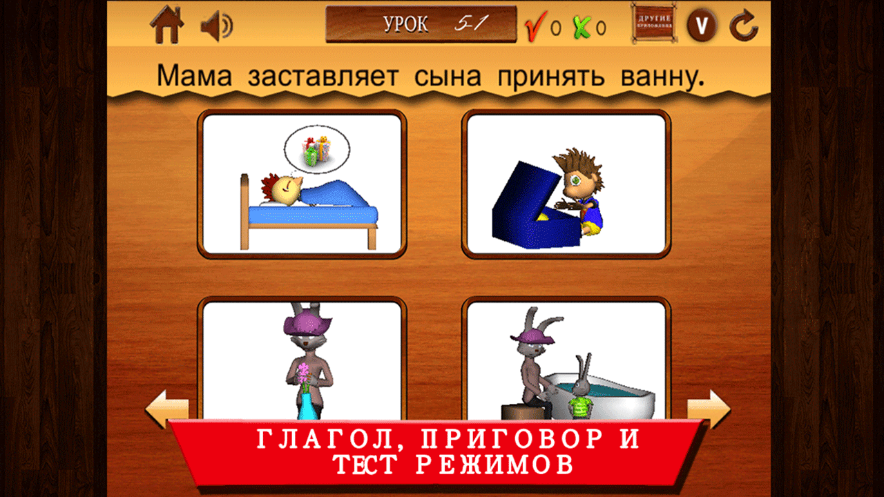 • существует возможность перейти в режим «глаголы», прервав урок в любое время, при этом звучит соответствующий глагол и появляется его написание