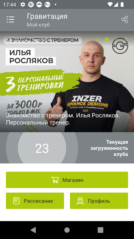 L'applicazione mobile è disponibile per i membri del club "Gravity". Si può aiutare a: seguire le notizie e gli annunci del club, seguire il programma per ricostituire l'equilibrio registrato nel allenamento.