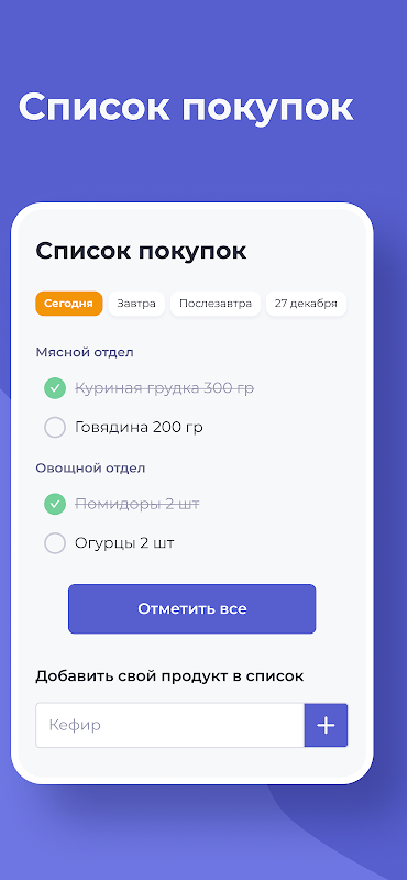 Quando crei un menu scegliendo le ricette nell'app, viene generata automaticamente una lista della spesa per i prossimi giorni. Tutti i prodotti sono suddivisi in reparti del negozio e ogni articolo della lista può essere contrassegnato come acquistato con un clic.