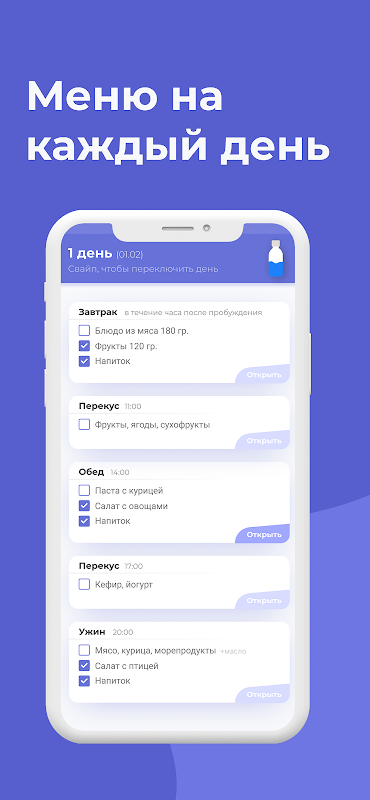 Composto da 3 pasti principali (colazione, pranzo, cena) e 2 spuntini. Puoi scegliere quello che ti piace di più tra i piatti di diverse categorie. Non ti piace il pesce o i frutti di mare? Non importa: l'applicazione offrirà ricette sostitutive per carne o pollame.