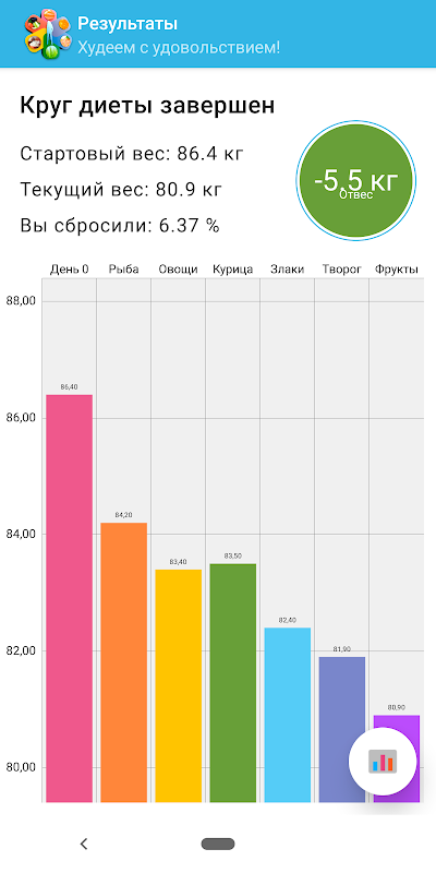 Anche con l'aiuto di questa applicazione è possibile tenere traccia dei tuoi progressi, e - come si procede attraverso le informazioni dieta sui vostri successi saranno compilati in grafici visivi luminosi e tabelle, che consente di visualizzare tutte le informazioni necessarie - ed è tutto chiaro e colorato! Certo, è possibile sorprendere i dintorni, concedetevi e rendere piacevole alle persone giuste)