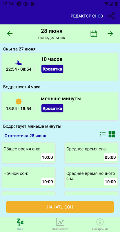 - Смотреть на изменения времени сна, с помощью диаграммы и графика