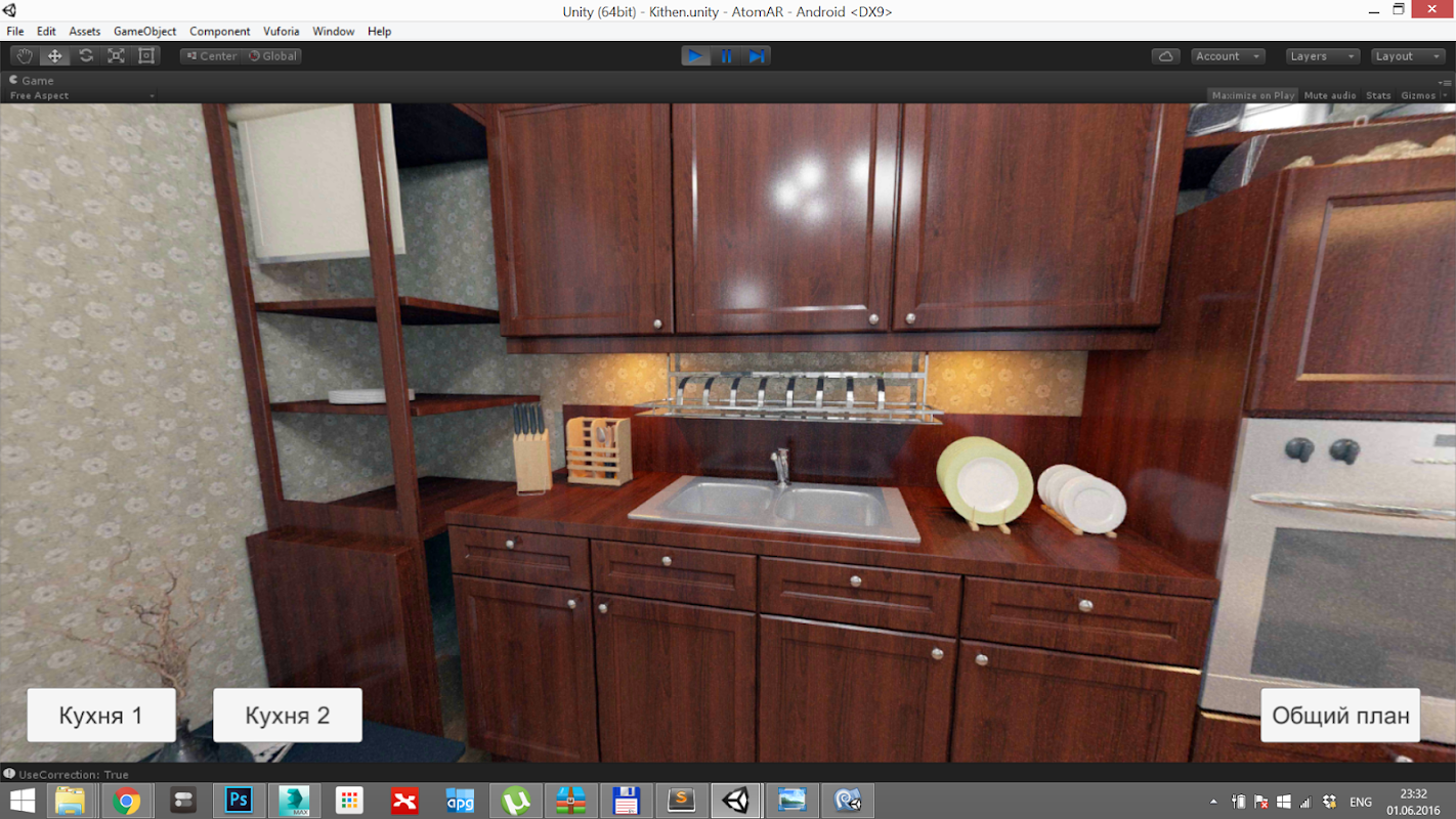 При выборе кухни, покупатель перемещается в 3D пространство и может ознакомиться с двумя вариантами планировки