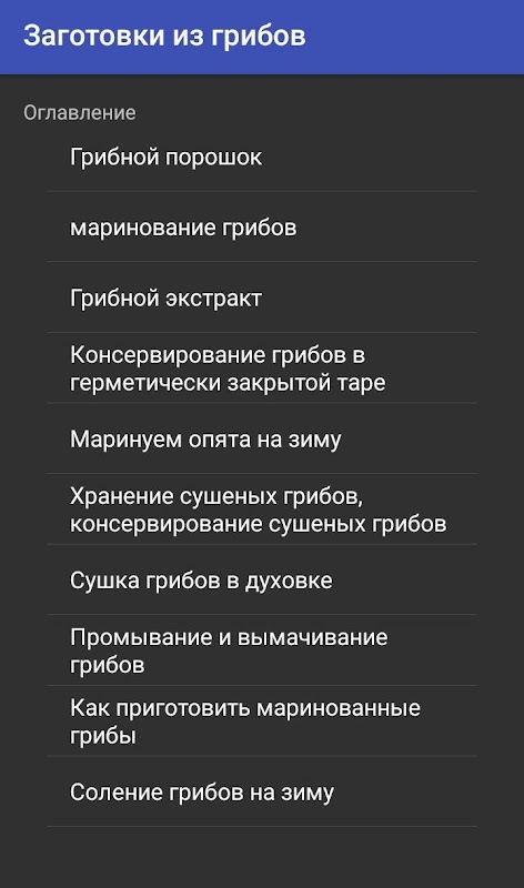 В приложении рассказывается о различных заготовках из грибов на зиму. Такие заготовки, как маринование, засолка, сушка и другое.