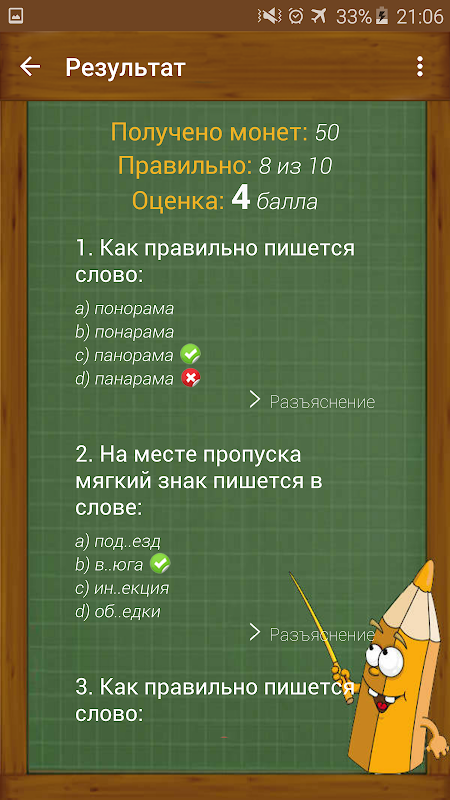Questa appendice contiene vari test su lingua russa, matematica e geografia. Grado di difficoltà: facile - medio - difficile. Per il passaggio del livello si ottengono monete, che in seguito si possono scambiare per suggerimenti. Per aprire l'attività successiva, è necessario passare alla precedente. Il test è considerato non superato con un punteggio inferiore a 3 punti. Buona fortuna e buon umore durante il gioco di passaggio! :)