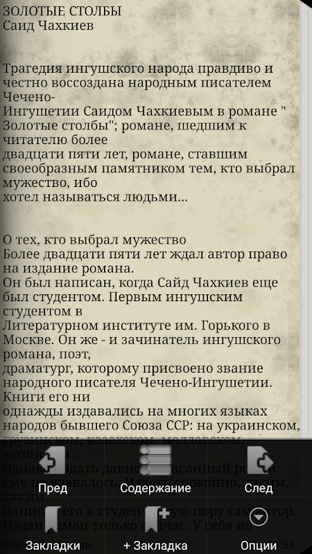 Трагедия ингушского народа правдиво и честно воссоздана народным писателем Чечено-Ингушетии Саидом Чахкиевым в романе «Золотые столбы», романе, шедшем к читателю более двадцати пяти лет, романе, ставшем своеобразным памятником тем, кто выбрал мужество, ибо хотел называться людьми…