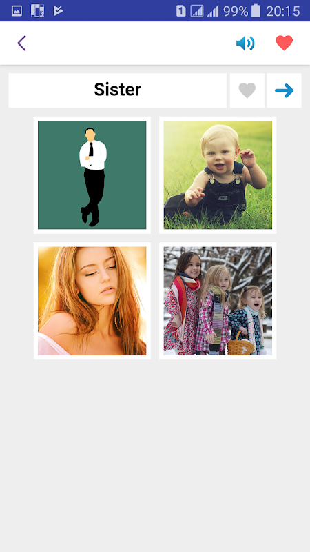 Ещё вы можете открыть из предложенных разделов, список всех английских слов, относящийся к разделу. При нажатии на картинку проигрывается произношение слово. Можете нажать на сердечку и она добавиться в список избранные слова.
