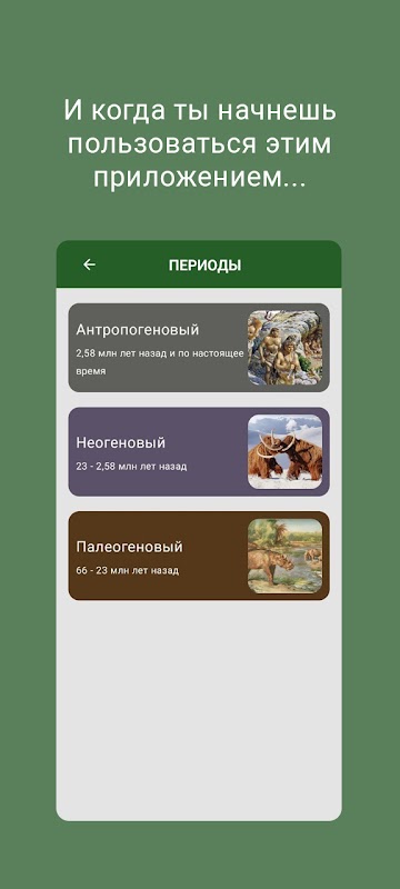 1. Ere e periodi: l'applicazione contiene informazioni su tutte le principali epoche e periodi della storia della Terra, dall'Eoarcheo all'era moderna del Cenozoico.