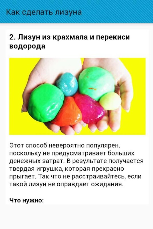 Создание лизуна в домашних условиях очень простое занятие. Самодельный вариант лизуна, не станет светиться в темноте, как настоящий, однако будет растекаться, липнуть, менять свою форму. Вариантов создания этой незатейливой игрушки много, как и разнообразие материалов для его изготовления: например, муки, мыла, зубной пасты, клей, шампуня и воды. Цвета вы можете выбирать самые разные, используя пищевой краситель или, например, гуашь.