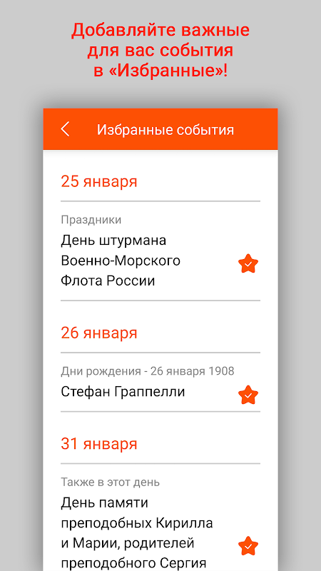 Calend.ru è il più grande sito in lingua russa dedicato alle date. Il nostro progetto non ha analoghi diretti e supera tutte le risorse con contenuti simili in termini di quantità di informazioni fornite. In totale, il nostro database contiene oltre 6000 articoli su vari eventi, preparati da editori professionisti, costantemente integrati e aggiornati. Tutte le informazioni nella nostra applicazione sono attentamente controllate : siamo fidati di banche e operatori di telefonia mobile, autorità governative e presentatori di programmi radiofonici e televisivi.