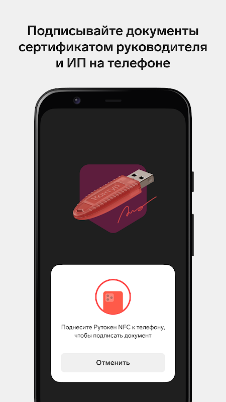 Kontur.Signature è un'applicazione Kontur per manager e singoli imprenditori che desiderano firmare rapidamente documenti utilizzando il proprio telefono. Ora non hai più bisogno di un computer con token: aggiungi uno o più certificati CEP all'applicazione utilizzando un codice QR e assegna loro nomi chiari. Affinché l'applicazione funzioni, il telefono deve supportare NFC e il certificato di firma elettronica deve essere archiviato su uno speciale Rutoken EDS 3.0 con un chip NFC.