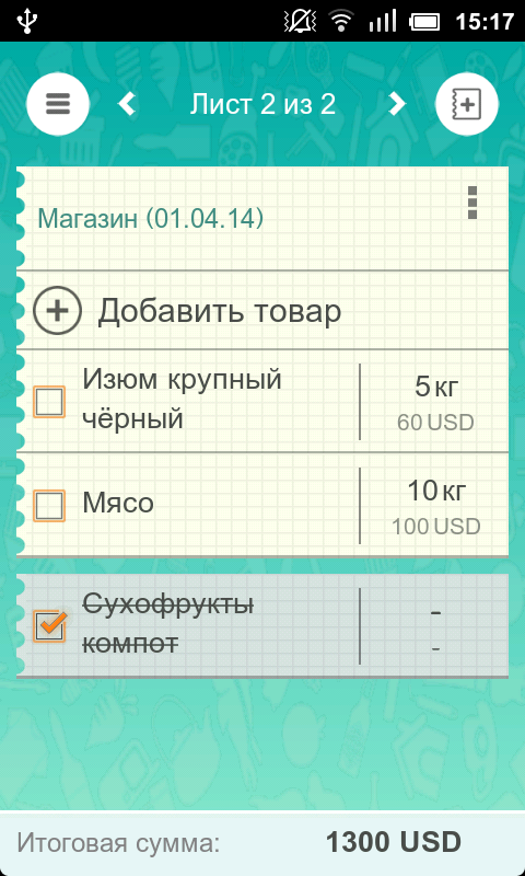 Управляйте вашими списками покупок. Создавайте списки, вносите в них товары, которые нужно купить, указывайте их количество, цену.