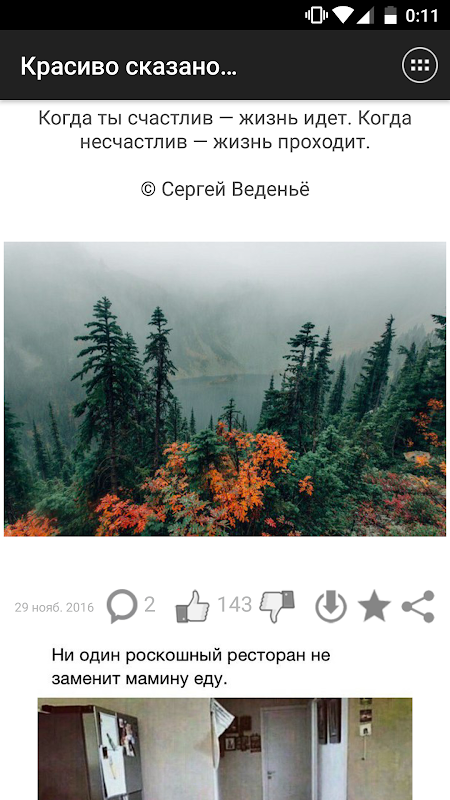 Понравившиеся записи можно комментировать и оценивать. Все понравившиеся картинки можно сохранять в галерее устройства в папке приложения. Ты можешь делиться записями с друзьями через социальные сети Facebook, Вконтакте, Одноклассники, Viber, WhatsApp а так же другие установленные на устройстве приложения. Ну и конечно, ты можешь оставлять лайки и сохранять записи в избранное.
