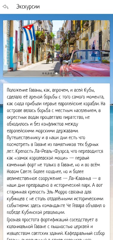 Ci sono momenti in cui viaggi da solo o in coppia e vuoi fare un'escursione interessante a Cuba, ma è costosa, poiché la guida addebita una quota di gruppo. In questa applicazione puoi trovare compagni di viaggio per escursioni congiunte e ridurre il costo del tour. Nella sezione "Compagni di viaggio" dell'applicazione, pubblica il tuo post e sarà visibile agli altri utenti dell'applicazione entro un raggio di 10 chilometri. E quando fai clic sull'icona "geolocalizzazione", puoi vedere tu stesso altre offerte simili entro un raggio di 10 chilometri da te! Inoltre, nell'applicazione, puoi fare una prima conoscenza con le città di Cuba, scegliere un luogo in cui viaggiare guardando i luoghi e le recensioni video. L'applicazione contiene anche informazioni su agenzie di viaggio, agenzie di viaggio e hotel che offrono i loro servizi nella città selezionata.