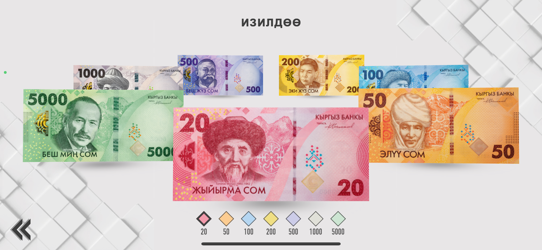 L'applicazione mobile "Kyrgyz Som" è stata sviluppata dalla Banca nazionale della Repubblica del Kirghizistan per dimostrare in formato interattivo gli elementi di sicurezza delle banconote kirghise del 2023.