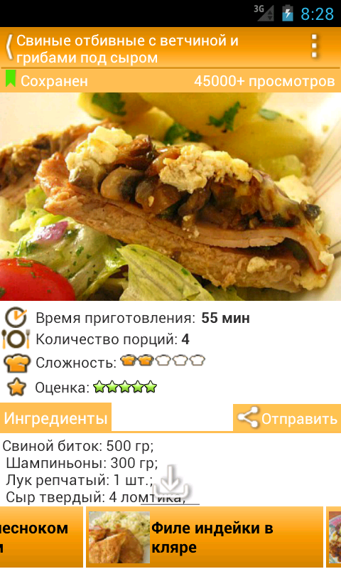 - возможность отправить список ингредиентов как список покупок по смс или через другой установленный на телефоне месседжер (WhatsApp, Skype, E-mail и т.д.);